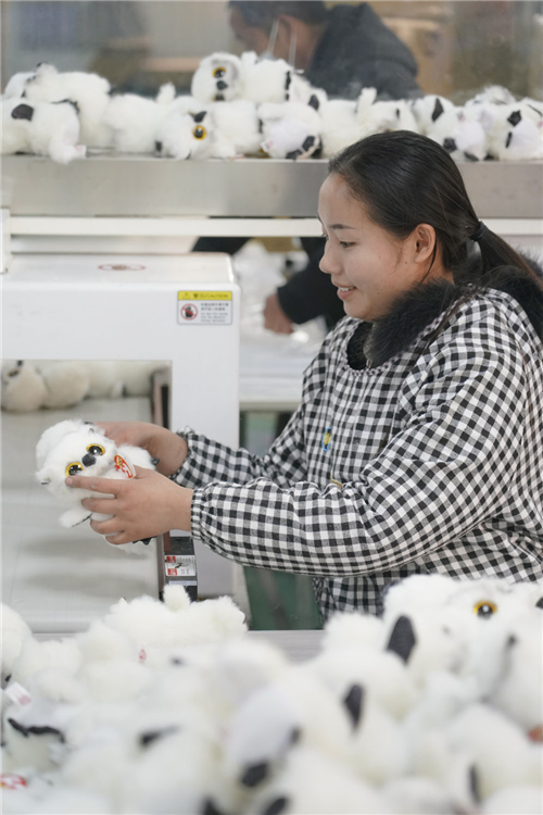在安康新偉泰玩具制品有限公司的生產(chǎn)車間內(nèi),一名工人在檢驗產(chǎn)品商標(biāo)(2月22日攝)。新華社記者邵瑞攝