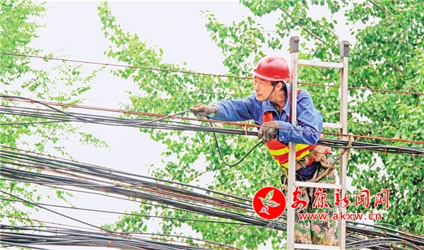 圖1、2、3:7月18日上午,在漢濱區(qū)大南街,國(guó)網(wǎng)安康供電公司漢濱供電分公司的工作人員正在對(duì)電網(wǎng)線路進(jìn)行整治。 記者 張喬 攝