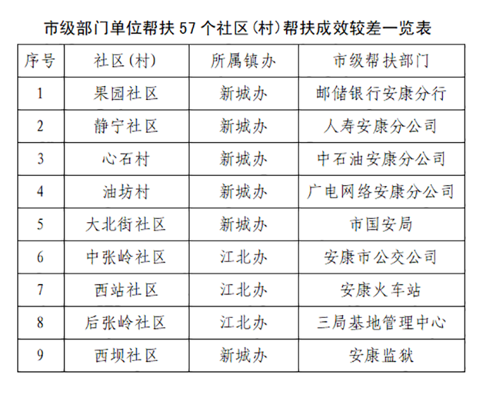 三、市級部門單位幫扶57個社區(村)幫扶成效較差一覽表Hfr安康新聞網