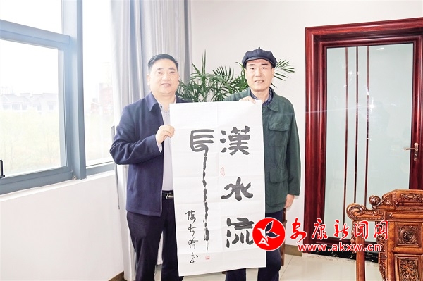 著名作家陳長(zhǎng)吟(右)向恒口示范區(qū)捐贈(zèng)書法作品。
