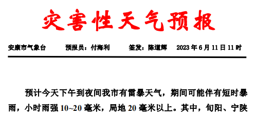 6月11日11時,安康市氣象臺發布災害性天氣預報: