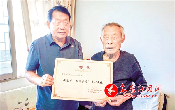 安康市書香少兒讀書會負責人李煥龍為鄺民三送上“愛心大使”聘書。8J9安康新聞網