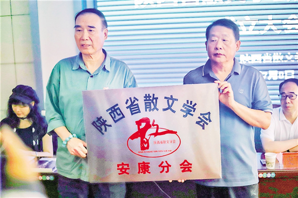 中國散文學會副會長、陜西省散文學會會長陳長吟向省散文學會安康分會會長李煥龍授牌。