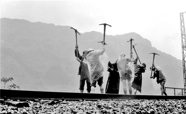 這里在大巴山深處,找不到三尺平地,無法安置站臺,鐵道兵就把站臺修在橋面上。車站值班室是間磚房,一張桌子,兩張椅子,兩個值班員,一正一副。充當(dāng)站臺的橋面上鋪了三股鋼軌,一股供臨時停車用,另兩股通往山外。站臺對面是山,筆陡如削,巖石如鐵,透溢著拒人千里的冷色。