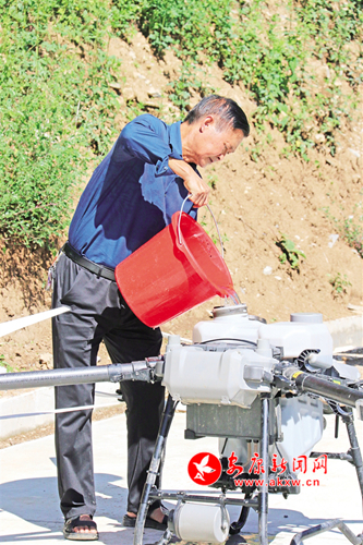 作為西河村獼猴桃園區負責人,69歲的何克祥正站在山路上指揮著無人機對園區果樹進行飛防。