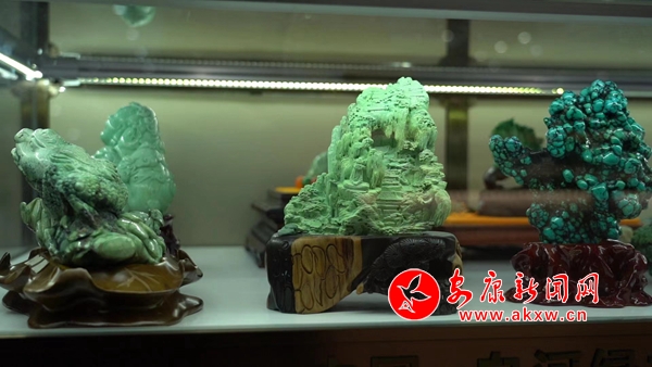 松石展柜中,擺放著各類精致時尚的綠松石飾品,這些通過雕刻家設計打磨后的擺件、項鏈、手鏈、耳墜等,都是藝術(shù)臻品,它們吸引著人們的目光,讓人愛不釋手。