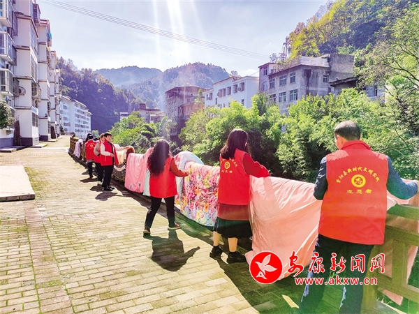 紫陽縣高橋鎮桂花樹社區組織新時代文明實踐志愿者服務隊,幫助社區行動不便的獨居老人、殘疾人曬被子、裝過冬棉被。胡波 王順勤 攝