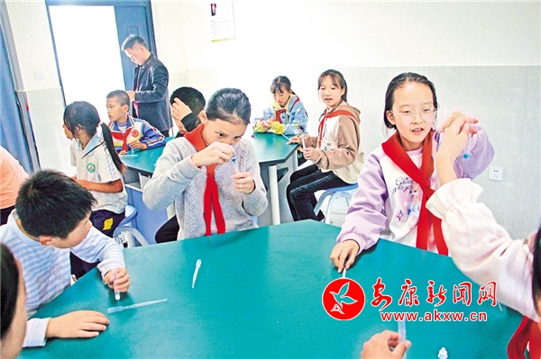 老縣鎮中心小學學生動手體驗酸堿中和實驗。 吳風軍 攝
