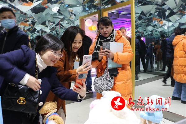 學員在恒口示范區(qū)毛絨玩具文創(chuàng)“五大中心”參觀,紛紛圍住自己感興趣的毛絨玩具討論拍照。
