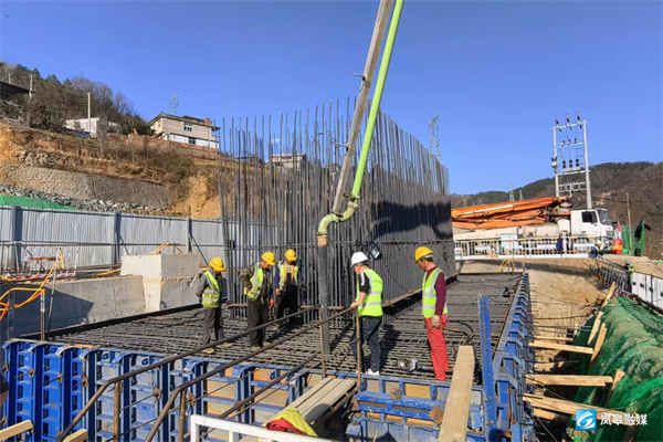 “對施工現(xiàn)場承臺尺寸測量和檢查,確保承臺的尺寸和位置準確無誤。隨后按照設計圖紙及規(guī)范要求綁扎承臺鋼筋,布設降溫管,埋設墩身預埋鋼筋,定型鋼模板安裝加固,以確保承臺的強度和穩(wěn)定性。”現(xiàn)場技術員高敬智說道。施工中,參建單位嚴格落實安全質量技術交底,優(yōu)化施工配置,項目技術人員全程盯控,按標準化施工要求分層澆筑、振搗、下料,確保混凝土澆筑順利進行。