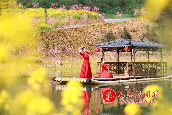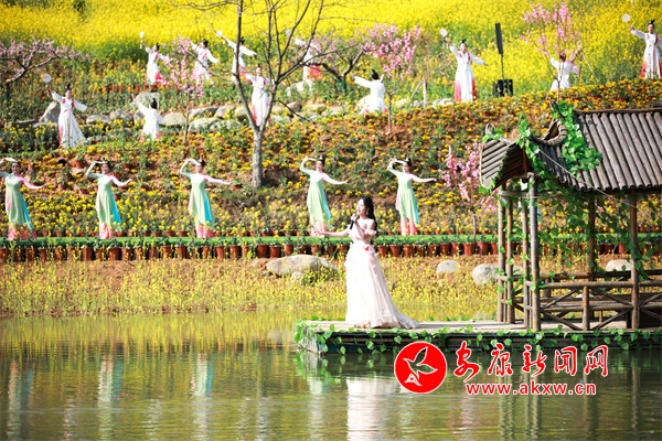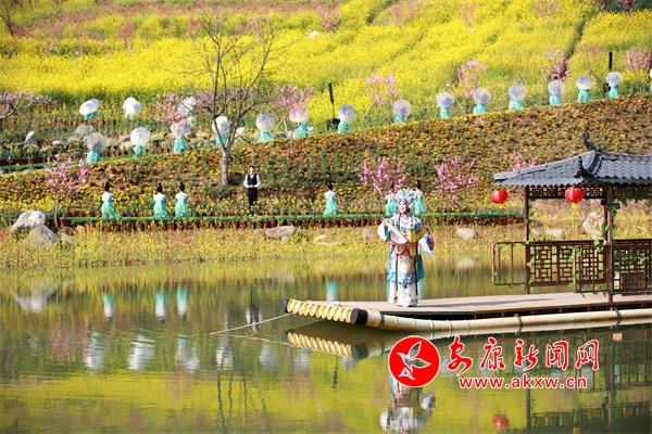春日的水田溝村生機勃發,漫山的油菜花在暖陽下爭相怒放,山坡下是一汪清澈的湖水。活動依山就勢、水陸并用,將演員、舞臺、道具與水田溝村地形地貌完美融合,營造出“人在畫中游,畫在景中走”的和美景象。隨著原創歌曲《水田溝的油菜花》悠揚動聽的歌聲從湖面的小船傳來,活動正式拉開帷幕,獨唱《問春》、情景詩朗誦《母親河》、歌伴舞《醉美桃花源》、情景劇《桃花源記》、漢劇歌舞《喬木花》、原創歌曲《阿依娜》、歌伴舞《幸福安康》等精彩節目相繼上演,悠揚的歌聲、曼妙的舞姿在湖上、在油菜花田、在蜿蜒的山路漸次呈現,將現場觀眾和游客迅速帶入安康桃花源美麗夢幻的油菜花海世界,沉浸式感受安康高新區產城綠融合發展和鄉村振興的顯著成效。