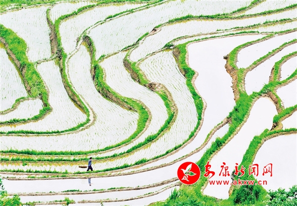 一層層的梯狀田地從高到低排列開(kāi)來(lái),流水般的線條分布在田埂之中,像是一篇歌頌大地的交響樂(lè)章。尤其是到了春天,灌水后的梯田波光瀲滟,記錄下每一刻的日出日落、云卷云舒。