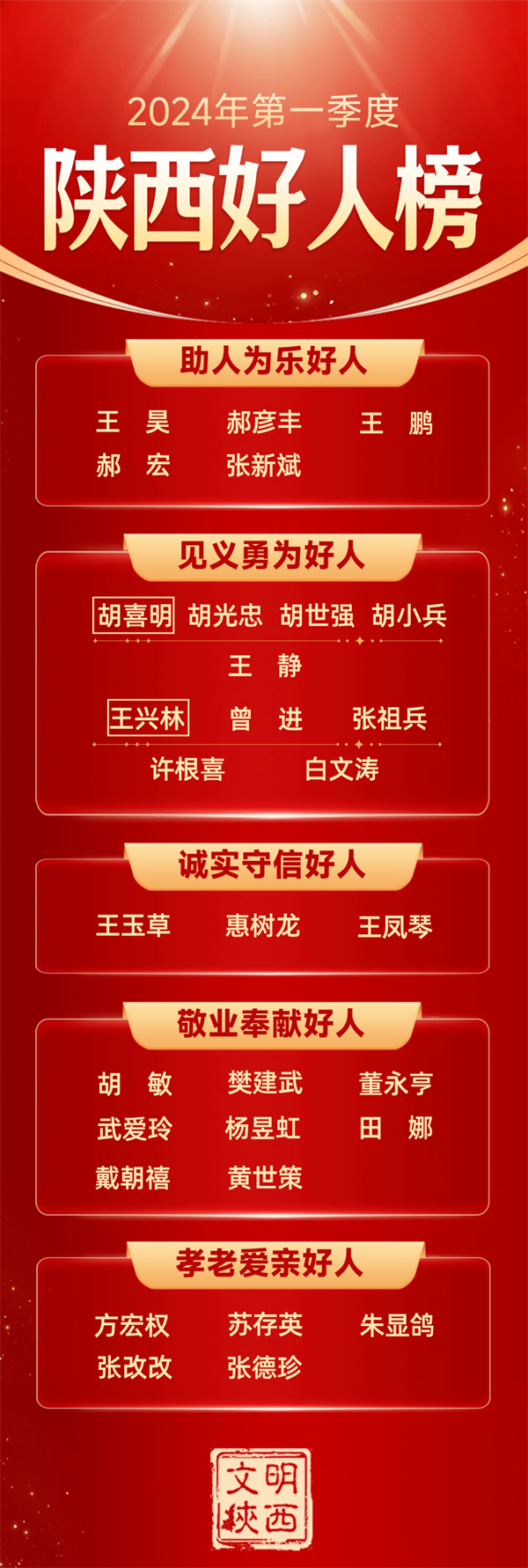 4月25日下午,2024年第一季度陜西好人榜發布儀式暨道德模范與身邊好人現場交流活動在西安市高陵區舉辦 。我市助人為樂好人張新斌,見義勇為好人王興林、曾進、張祖兵,誠實守信好人王鳳琴光榮上榜,一起來看看他們的光榮事跡。