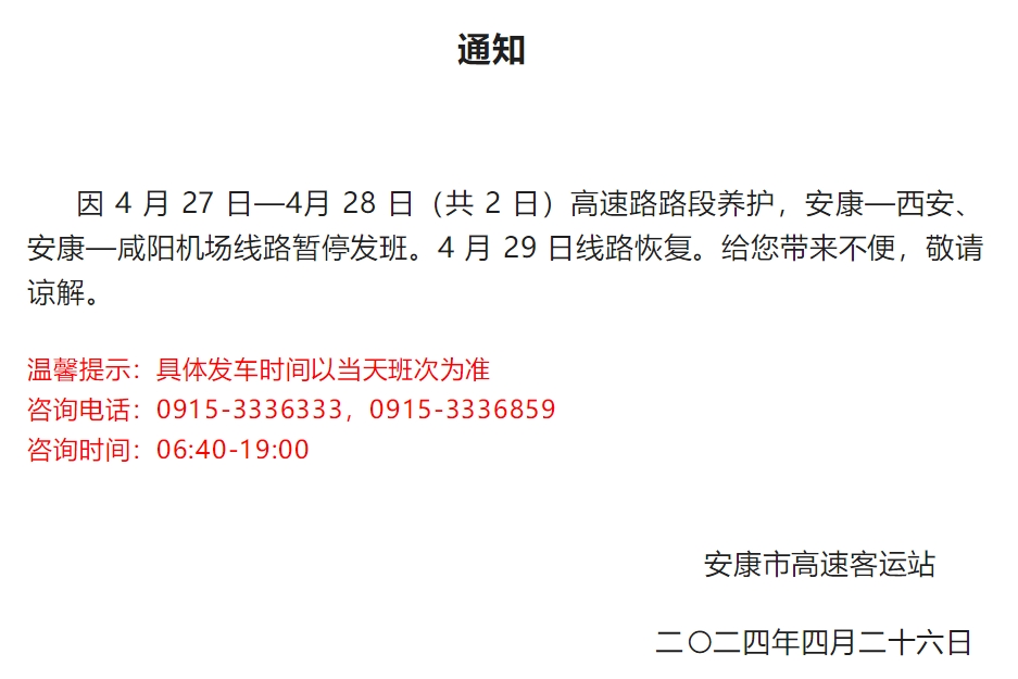 4月26日,安康高速客運(yùn)站發(fā)布通知: