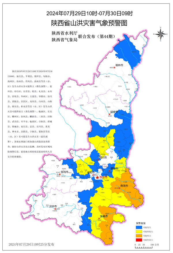 陜西省水利廳與陜西省氣象局聯合發布山洪災害氣象預警:預計7月29日10時至7月30日9時,下圖中所示縣(區)可能發生山洪災害,其中我市漢濱區、嵐皋縣、白河縣發生山洪災害可能性較大(黃色預警),漢陰縣、寧陜縣、紫陽縣有可能發生山洪災害(藍色預警),各級水利部門要加強山洪隱患巡查排查,做好山洪災害站點監測,及時發布區域風險預警信息,地方政府應依法提前組織人員安全轉移避險。GCd安康新聞網