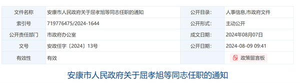 安康市人民政府關于屈孝旭等同志任職的通知pPK安康新聞網