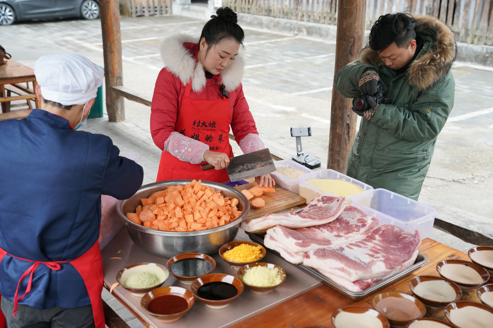 2月21日,在安康市漢濱區(qū),李花(中)在她的農(nóng)家樂院內(nèi),制作準備用于網(wǎng)絡銷售的蒸碗,并拍攝短視頻。李花和丈夫從經(jīng)營農(nóng)家樂起步,后通過短視頻和直播等方式,在……