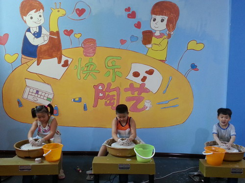 孩子們興致勃勃,當看到展柜上擺放著各式玲瑯滿目的陶藝作品時,無不欣喜萬分,贊不絕口。在認真聽完陶藝老師的教導后便都迫不及待地躍躍欲試,紛紛卷起衣袖,摩拳擦掌,奔向各自的工作崗位,有的拉坯,有的塑泥,有的彩繪,忙的不亦樂乎。揉、挫、捏、摔,不一會兒,便做出了各種千奇百怪的造型,盡管這些作品還算不上精美,但卻表現出孩子們極大的熱情和想象力。來自安師附小的張同學一邊捏著泥巴,一邊說道:“等我做好了,就拿回去送給爸爸媽媽,讓他們看看我的杰作。”而來自安康中學的周同學則表示:“陶藝活動很有意思,可以隨心所欲,無拘無束。”當一件件充滿稚氣和夢想的作品成功出爐時,我們和孩子們一樣心中充滿了自豪和成就感。每次活動結束時,不少學生仍意猶未盡,表示希望能在節假日和父母一起來陶藝館度過美好的一天。