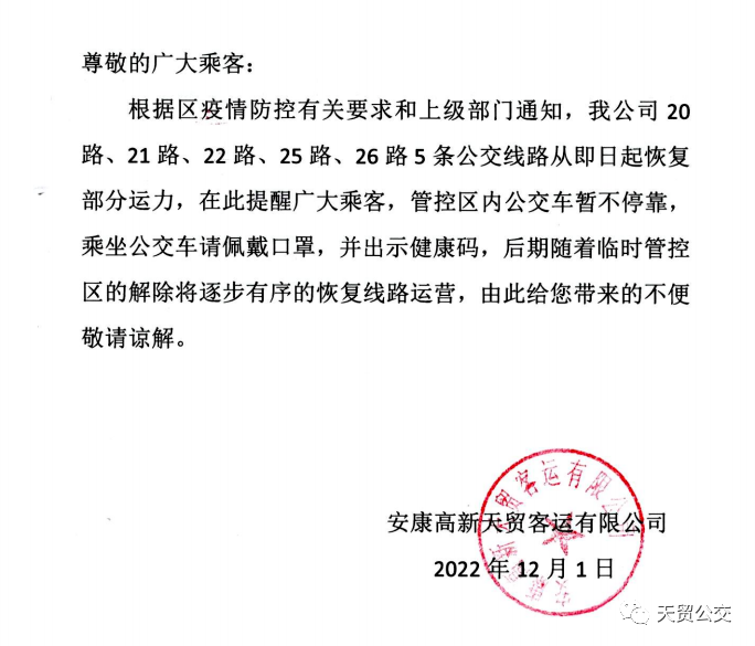 按照市道路運輸服務中心印發的《中心城市有序恢復公交、出租客運行業運輸服務工作的實施方案》要求,為更好滿足復工復產和市民出行需求,自12月1日12:00起,我公司1路、3路、4路、5路、9路、12路、13路、16路8條公交線路恢復營運,車輛趟次隨運營需求逐步增加,其他線路逐步有序恢復。2sh安康新聞網