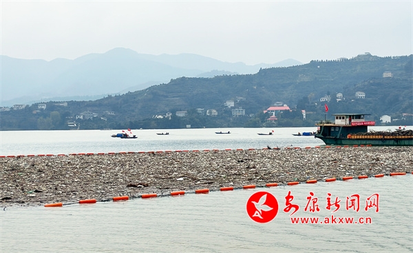 10月15日,筆者跟隨打撈隊來到瀛湖鳥島,大量的漂浮物被圍攔在河灣附近,與主河道形成鮮明對比。打撈隊負責人袁曉林介紹:“因秋淋天氣,9月中下旬起,安康經歷十幾天的連陰雨,水位上漲,岸邊被淹沒的樹木、雜草就會在水面漂浮,影響水質和景觀。我們在景區鳥島、清泉村、湖心街、南溪、流水等地分段集中打撈,提高效率,不影響旅游和通航。”