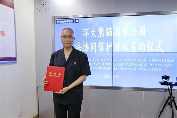 西安市中級人民法院黨組書記、院長趙雷、西安鐵路運輸中級法院黨組副書記、副院長王琪軒、四川省成都市中級人民法院黨組成員、副院長謝立新、成都鐵路運輸中級法院黨組成員、副院長徐翔、甘肅省林區(qū)中級法院黨組成員、副院長唐開明分別致辭。西安市中級人民法院審判委員會專職委員張曼慧介紹《環(huán)大熊貓國家公園司法協(xié)同保護協(xié)議》的主要內(nèi)容。