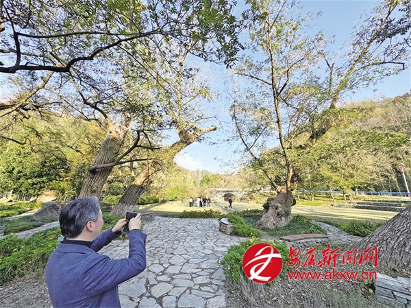 隨后采訪團驅車駛入雙嶂村,一眼看見高大的“麻柳”古樹。據悉,這些古樹一共16棵,樹齡約500年。古樹的枝干或挺拔如衛士,或斜臥似老者,繁密的枝葉織成巨傘,將整片草坪籠在樹蔭里。樹下游客紛紛舉起相機拍照,快門聲伴著歡聲笑語。kSt安康新聞網