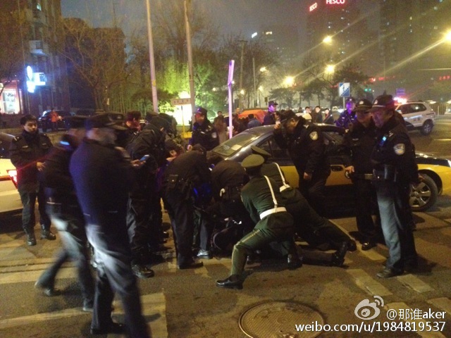 當時附近行人很多,該男子先是由西往東走了一小段,“這時候店內沖出來了兩名身穿西服的男性工作人員,拿著金屬制品開始追趕該男子,”該男子見狀從兜里掏出了一把長約20公分的水果刀,一邊罵人,一邊越過馬路由東往西跑,兩名男店員在后面緊追不舍。圖為網傳抓捕現場。DGz安康新聞網