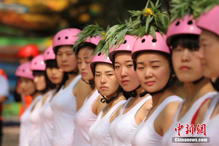 4月29日,河南省三門峽市女子漂流救援隊員佩戴偽裝成花草的視頻記錄儀,對漂流河道進行安全檢查。該視頻記錄儀可放置在頭頂對全身進行監控、也可以放置在胸部、下身等處對局部進行監控。據了解,這種裝備是為了防止少數故意落水的男游客,對女救援隊員動手動腳的不文明行為。圖片來源:CFP視覺中國3Up安康新聞網