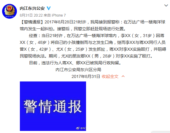 據8月31日內江東興公安發布的警情通報稱,網傳視頻記錄的實為2017年8月28日發生在四川內江萬達廣場的一起糾紛。8月28日21時許,警方接到報警稱:在萬達廣場一樓海洋球館內發生一起糾紛。接警后,民警立即趕赴現場進行處置。經查,當日21時許,在萬達廣場一樓海洋球館內,李某某(女,31歲)因蔣某某(女,48歲)將自己的小孩撞倒而與之發生口角,繼而李某某與蔣某某同行人員曾某(女,42歲)、尤某(女,25歲)發生抓扯,蔣某某對李某某實施毆打,并阻礙民警現場執法。期間,尤某的朋友卿某某(男,28歲)對李某某實施了毆打。隨后,違法行為人蔣某某、卿某某被內江公安行政拘留。