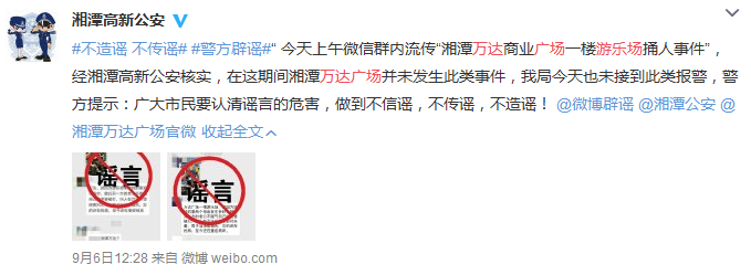 “求真”欄目記者發現,不止湖北黃石,湖南湘潭、益陽以及山東煙臺都曾傳出“萬達廣場發生打架捅人事件”的消息,各地網警都進行了辟謠。9月6日,湘潭高新公安通過官方微博表示,“經核實,湘潭萬達廣場并未發生網傳的‘游樂場捅人事件’,警方也未接到此類報警”。