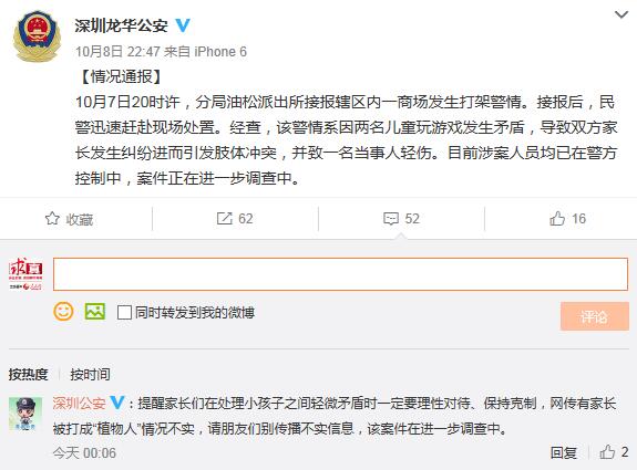 10月8日22時47分,深圳市公安局龍華分局官微對此進行了情況通報。10月7日20時許,分局油松派出所接報轄區內一商場發生打架警情。接報后,民警迅速趕赴現場處置。經查,該警情系因兩名兒童玩游戲發生矛盾,導致雙方家長發生糾紛進而引發肢體沖突,并致一名當事人輕傷。目前涉案人員均已在警方控制中,案件正在進一步調查中。
