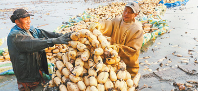 初冬時(shí)節(jié),江蘇省灌云縣的4.3萬余畝藕塘迎來采藕季。RzW安康新聞網(wǎng)