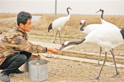 每天上午9點和下午3點,這位40多歲的“迷彩大叔”和鐵桶里的魚都會準時出現。這樣的工作,遼寧省盤錦市鶴類種源繁育基地副站長趙仕偉24年從未間斷。“迷彩大叔”和他的同事們共繁育成活丹頂鶴131只,占國內野生種群的1/5。