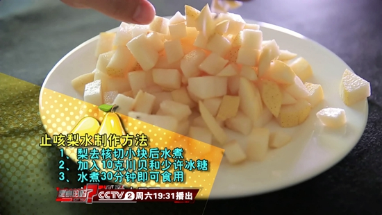 劉琳告訴我們:“梨有秋梨,雪花梨,鴨梨等,通常情況下都可以,但其中以雪花梨為最優。選擇梨時應盡可能選擇梨皮較厚且較粗糙的,因為梨皮作為藥材的治療作用是不可小覷的。加工過程中應保留梨皮,去籽,將梨切為小塊,然后配以少許川貝、冰糖一起放入水中煮至半小時,即可飲用。”