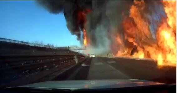 網傳行車記錄儀的視頻顯示,2月11日8時許,前方高速公路上有一輛油罐車側翻在地,記錄儀所在車輛停在路中,女司機說“后面(車)不倒我咋倒(車)”。此時右前方一輛小汽車往油罐車方向開了一點,正待倒車,突發巨響,車底爆燃,一瞬即被迅速蔓延的火焰吞沒。而正前方白色小汽車司機棄車急速向后奔跑。隨即行車記錄視頻中傳來所在車中女子的尖叫哭泣聲,有男子催促倒車加油,另有女子安慰。隨著記錄儀所在車輛緊急倒退,視頻中可見高速路旁樹木綠地成片燃燒,火光沖天。倒車約30秒后,這輛車終于離開了起火范圍。