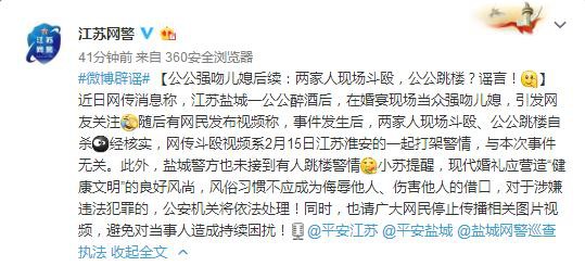 2月26日9時3 3分,江蘇省公安廳網絡安全保衛總隊官方微博“江蘇網警”對此辟謠,“經核實,網傳斗毆視頻系2月15日江蘇淮安的一起打架警情,與本次事件無關。此外,鹽城警方也未接到有人跳樓警情。”