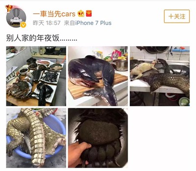 2018年2月15日(除夕)晚7時,微博賬號為“一車當先cars”的博主發布了一條名為“別人家的年夜飯……”的消息,并配發一組擺放在廚房里待烹制的熊掌、穿山甲、鱷魚等野生動物的照片,引發了網民的廣泛關注和大量轉發。