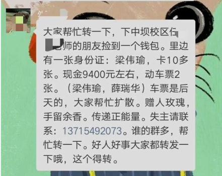 一條“失物招領”的信息在全國多地的微信群和朋友圈中熱傳,該信息稱:“我朋友撿到一個錢包,里邊有一張身份證:梁偉瑜,卡10多張,現金9400元左右,動車票2張(梁偉瑜,薛瑞華)。車票是后天的,大家幫忙擴散。贈人玫瑰,手留余香。傳遞正能量。失主請聯系:1362098XXXX。誰的群多,幫忙轉一下……”