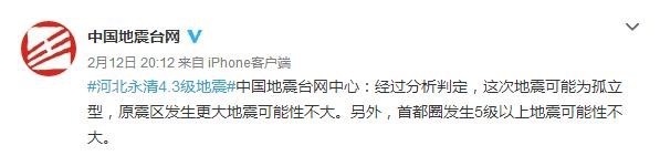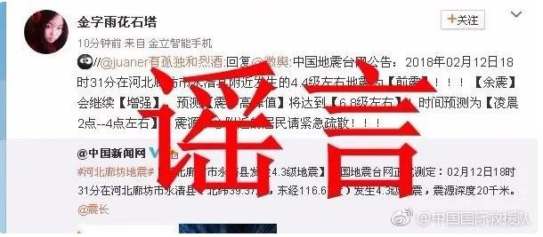 2月12日,河北永清地震發生不久后,網上有消息稱該縣“9958應急救援隊接到通知,今晚11點30分有余震活動。”12日19時57分,河北省廊坊市人民政府新聞辦官微“廊坊發布”對此辟謠稱,“純屬謠言,公安部門正在追查謠言的源頭,請廣大群眾勿信勿傳謠言,以權威發布為準。”