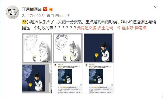 17日凌晨,該圖的原作者“正月插畫師”,微博認證為“插畫師、美術教師”,發布消息稱“我這畫似乎火了,火的十分突然。重點是我畫的時候,咋不知道這張圖與錦鯉是一個功效的呢??????”