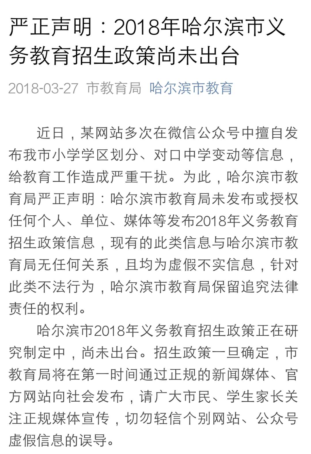 官方聲明表示,近日,某網(wǎng)站多次在微信公眾號(hào)中擅自發(fā)布我市小學(xué)學(xué)區(qū)劃分、對(duì)口中學(xué)變動(dòng)等信息,給教育工作造成嚴(yán)重干擾。為此,哈爾濱市教育局嚴(yán)正聲明:哈爾濱市教育局未發(fā)布或授權(quán)任何個(gè)人、單位、媒體等發(fā)布2018年義務(wù)教育招生政策信息,現(xiàn)有的此類信息與哈爾濱市教育局無任何關(guān)系,且均為虛假不實(shí)信息,針對(duì)此類不法行為,哈爾濱市教育局保留追究法律責(zé)任的權(quán)利。