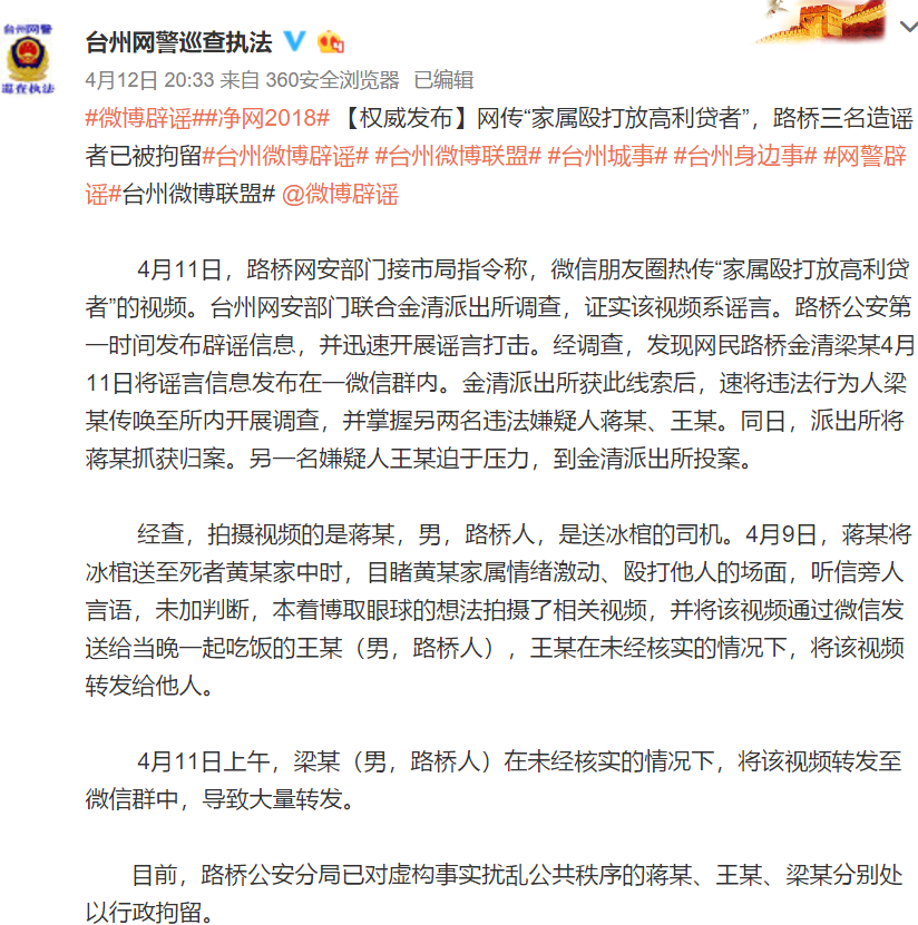 人民網(wǎng)北京4月13日電 (孝金波 楊思萱)近日,一則浙江臺(tái)州“家屬毆打放高利貸者”的視頻在微信群中流傳,臺(tái)州路橋區(qū)警方迅速調(diào)查情況,澄清辟謠。4月12日,路橋公安分局對(duì)三名涉謠者處以行政拘留。