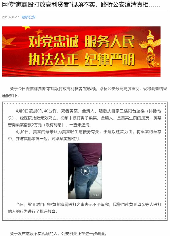 4月11日,據(jù)“路橋公安”官微發(fā)布辟謠消息稱,4月9日凌晨,浙江省臺(tái)州市路橋區(qū)金清鎮(zhèn)一黃某,酒后從自家三樓陽臺(tái)墜樓(排除他殺),經(jīng)醫(yī)院搶救無效死亡。視頻中被打男子為金清鎮(zhèn)梁某,是黃某生前的朋友,黃某曾向梁某借款2萬元(沒有利息),一直未還清。當(dāng)日,黃某的母親認(rèn)為黃某輕生與債務(wù)有關(guān),于是以還款為由,將梁某約至家中,并與其他家屬一起,對(duì)梁某實(shí)施毆打。事后,梁某對(duì)自己被黃某家屬毆打之事表示不予追究,民警也就黃某母親等人毆打他人的行為進(jìn)行了批評(píng)教育。