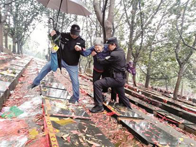 湖北武漢漢陽永豐派出所協警潘正好介紹,當日上午11時許,他和另外一名同事正在公墓內巡邏執勤時,接到一女子求助,稱南九墓區有位老人滑倒。他們趕到現場后,先將老人攙扶上了巡邏車。