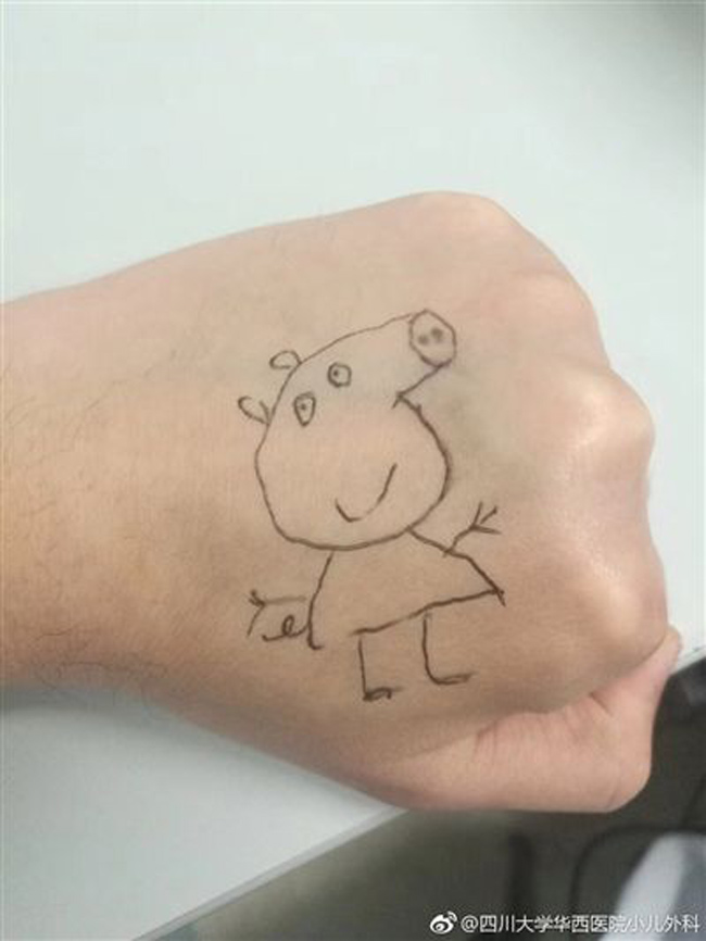 “小豬佩奇身上紋,值班用來哄病人。”4月7日,四川大學華西醫院小兒外科主治醫師楊磊為了讓患者小朋友們心情愉悅,主動在左手上畫了一只流行卡通人物小豬佩奇來“討歡心”。因為遵守無菌原則,小豬佩奇很快就被洗掉,但這一幕還是被網友點贊,認為“有愛且專業,感控愛心都需要。”