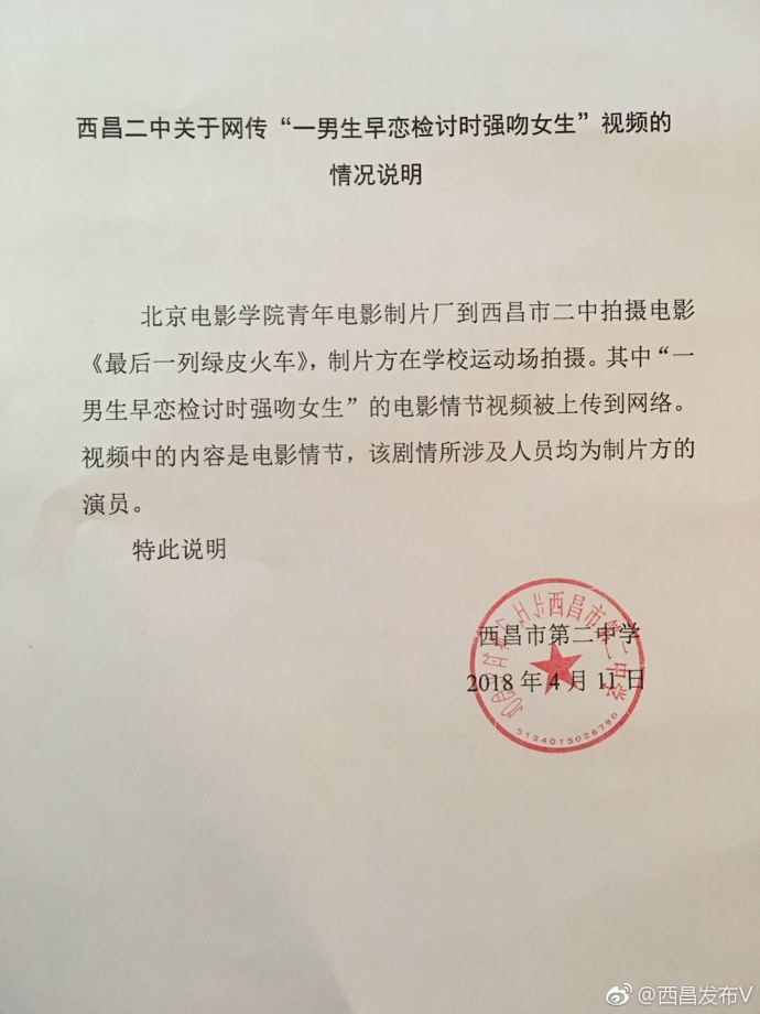 4月11日,西昌市政府新聞辦官微“西昌發布”發表對該視頻的情況說明。經查,該視頻中出現的內容實際為“上海一影視制作有限公司在西昌市拍攝某電影中的部分劇情片段,并非真實發生事件。拍攝時間為2018年4月8日,拍攝地點為西昌市第二中學,劇情中主人公為本片男女主演,并非西昌市二中學學生”。并附圖“北京市新聞出版廣電局《電影劇本〈梗概〉備案回執單》”、“西昌二中關于網傳‘一早戀男生檢討時強吻女生’視頻的情況說明”及在操場取景拍攝的照片。
