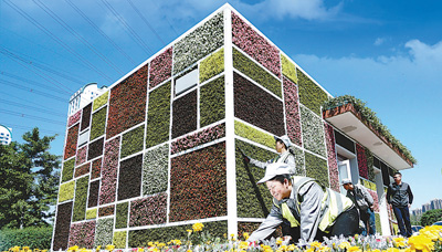 5月3日,北京市豐臺區花鄉草橋村環衛工人們正在對新建成的“花房式公廁”進行管護。為提升公廁服務品質,以花卉為主導產業的草橋村將綠色、衛生和美觀的理念融入到公廁的建設之中,該公廁的四邊外墻和房頂均由綠雕墻構成,從側面看整個房子像是五顏六色的大魔方。NX7安康新聞網