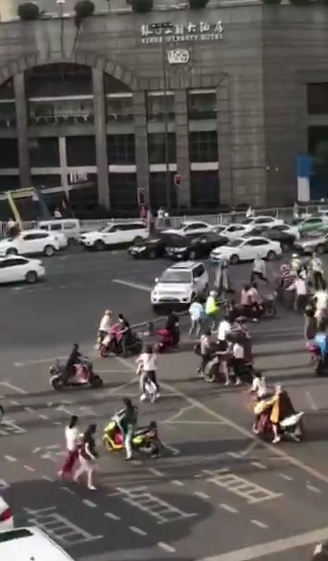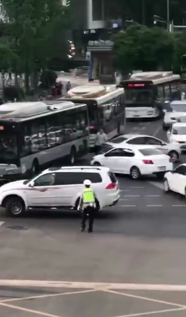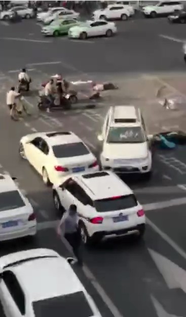 事故發生后,網上流傳著關于該案的現場視頻。一輛白色越野車在原地多次轉圈后,從順城大街逆向往鹽市口方向沖去,路口等待的多輛電瓶車被撞倒,最終撞向一輛白色汽車后停止。隨即,路口執勤交警和公安將肇事車駕駛員控制。