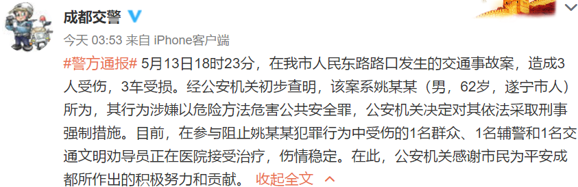 5月14日凌晨3時53分,成都交警通報,此事故造成3人受傷,3車受損。經當地公安機關初步查明,該案系62歲遂寧市姚某某所為,其行為涉嫌以危險方法危害公共安全罪,公安機關決定對其依法采取刑事強制措施。目前,在參與阻止姚某某犯罪行為中受傷的1名群眾、1名輔警和1名交通文明勸導員正在醫院接受治療,傷情穩定。公安機關感謝市民為平安成都所作出的積極努力和貢獻。