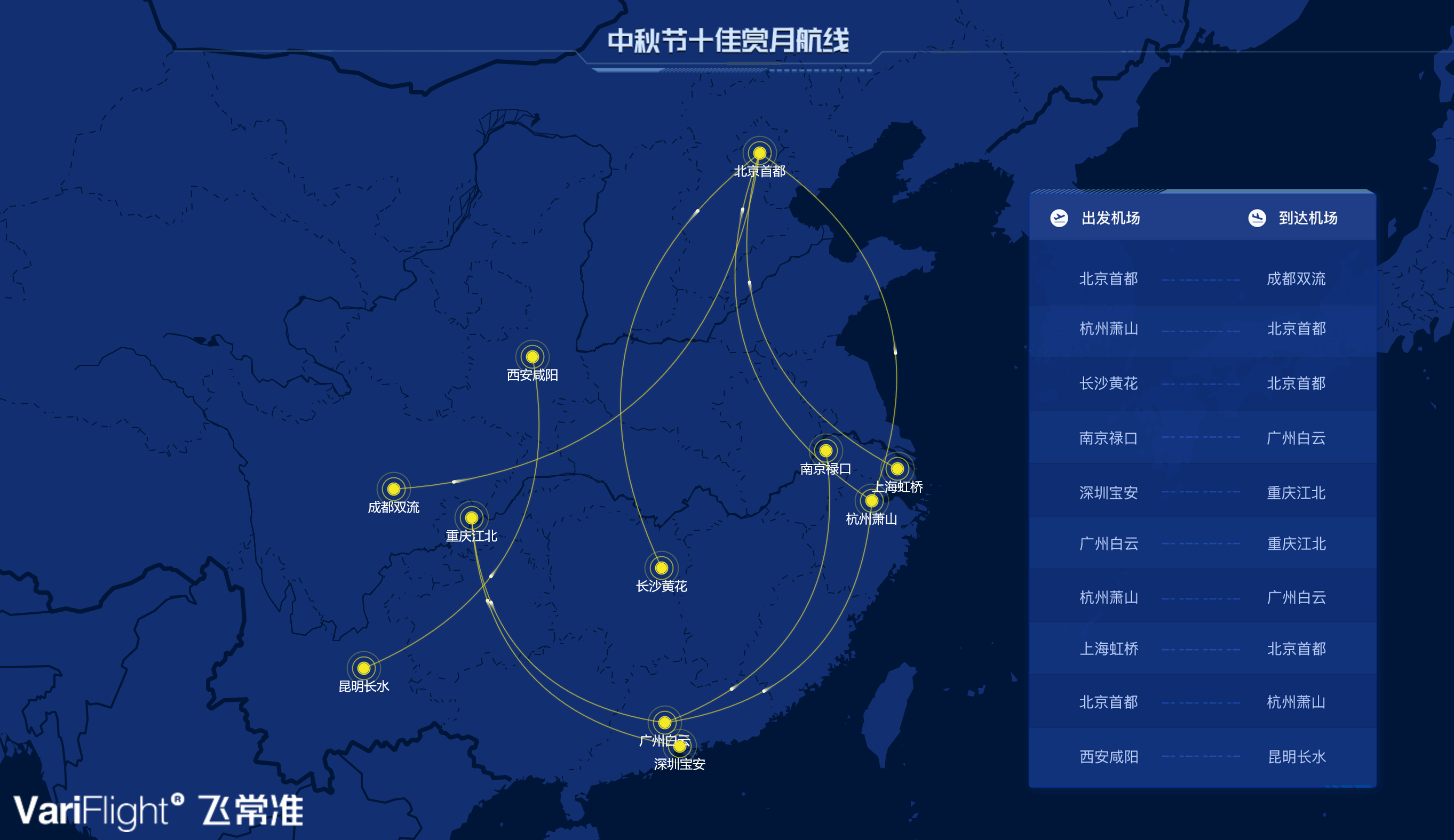 飛常準大數據顯示,今年中秋節十佳賞月航線分別是北京首都-成都雙流、杭州蕭山-北京首都、長沙黃花-北京首都、南京祿口-廣州白云、深圳寶安-重慶江北、廣州白云-重慶江北、杭州蕭山-廣州白云、上海虹橋-北京首都、北京首都-杭州蕭山、西安咸陽-昆明長水。